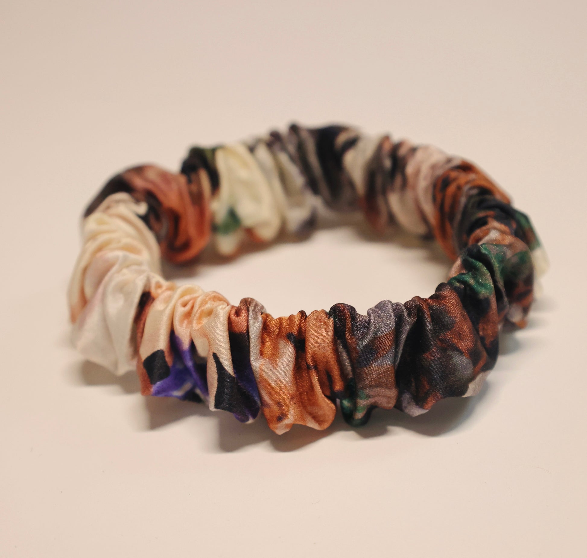 Inspired by vintage blooms and timeless artistry, this midi scrunchie is crafted from 100% silk and features a delicate floral print reminiscent of Renaissance tapestries. Its mid-size silhouette offers graceful volume—perfect for everyday styling or a romantic finishing touch.