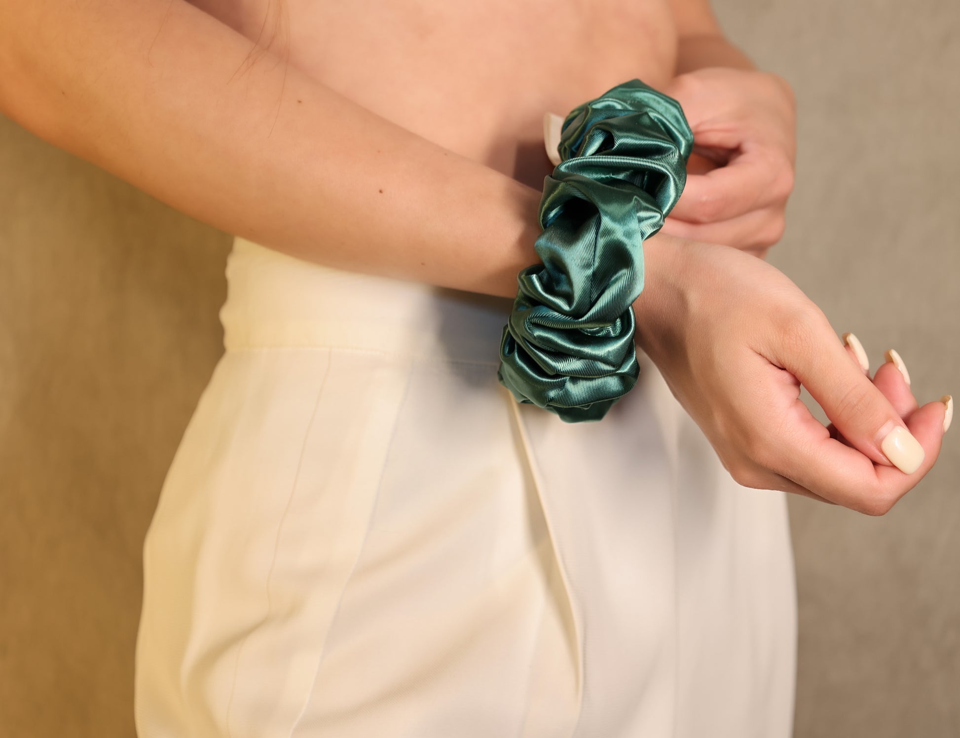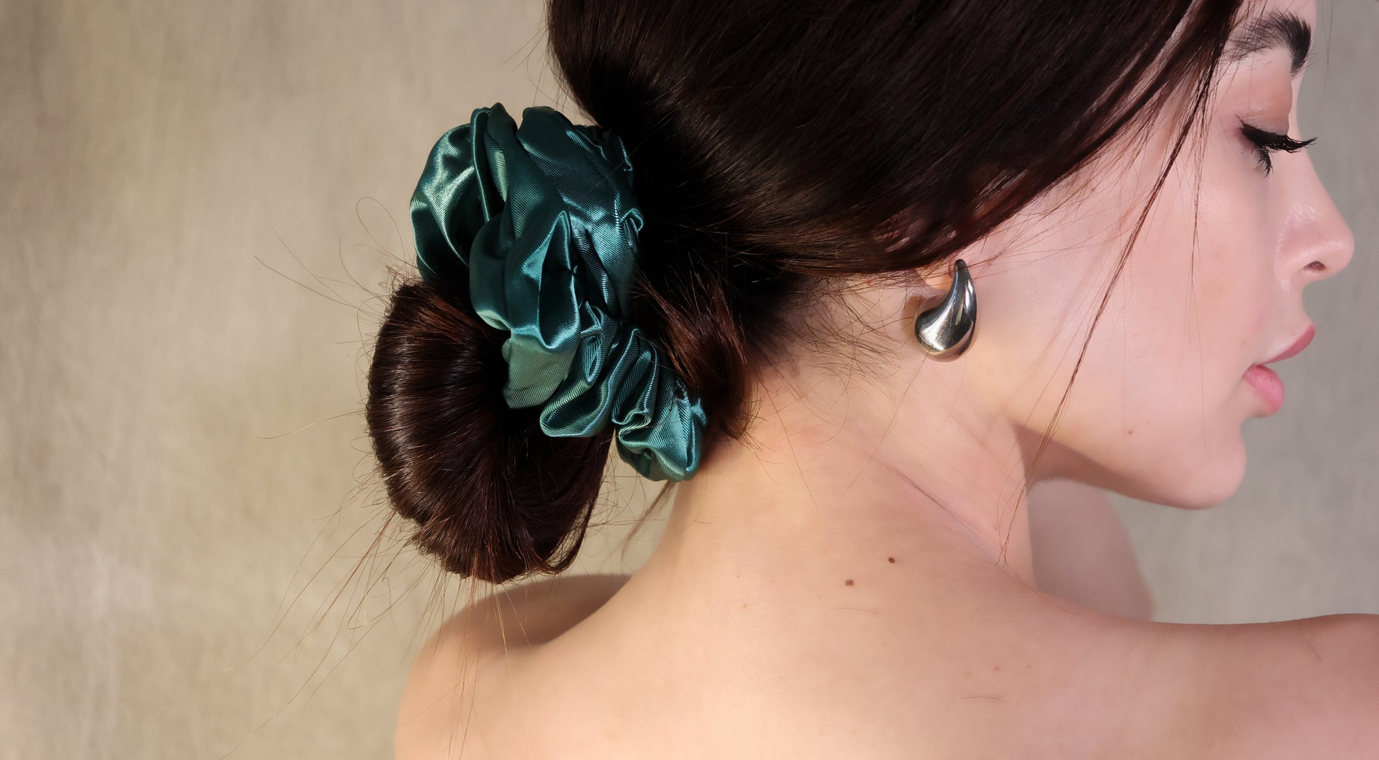 Designed for bold volume and a sleek finish, this extra-large scrunchie is crafted from glossy sateen for a luminous, silky look. Lightweight and gentle on strands, it’s perfect for statement styling with everyday ease.